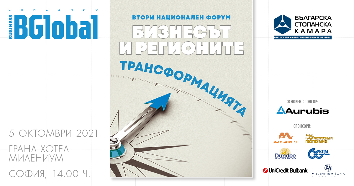 Българската стопанска камара (БСК) има удоволствието да Ви покани на конференцията „Бизнесът и регионите - Трансформацията", която ще се проведе на 5 октомври 2021 г., вторник, от 14,30 ч. в „Гранд хотел Милениум", София.